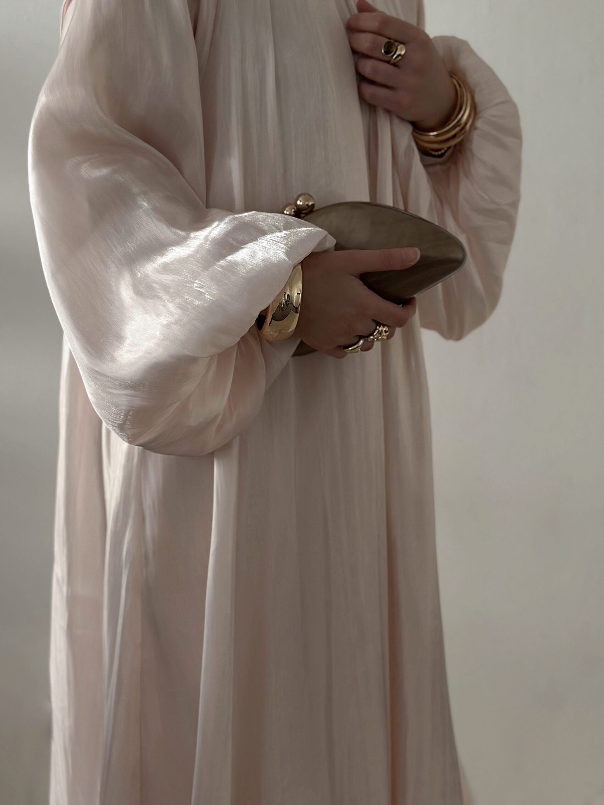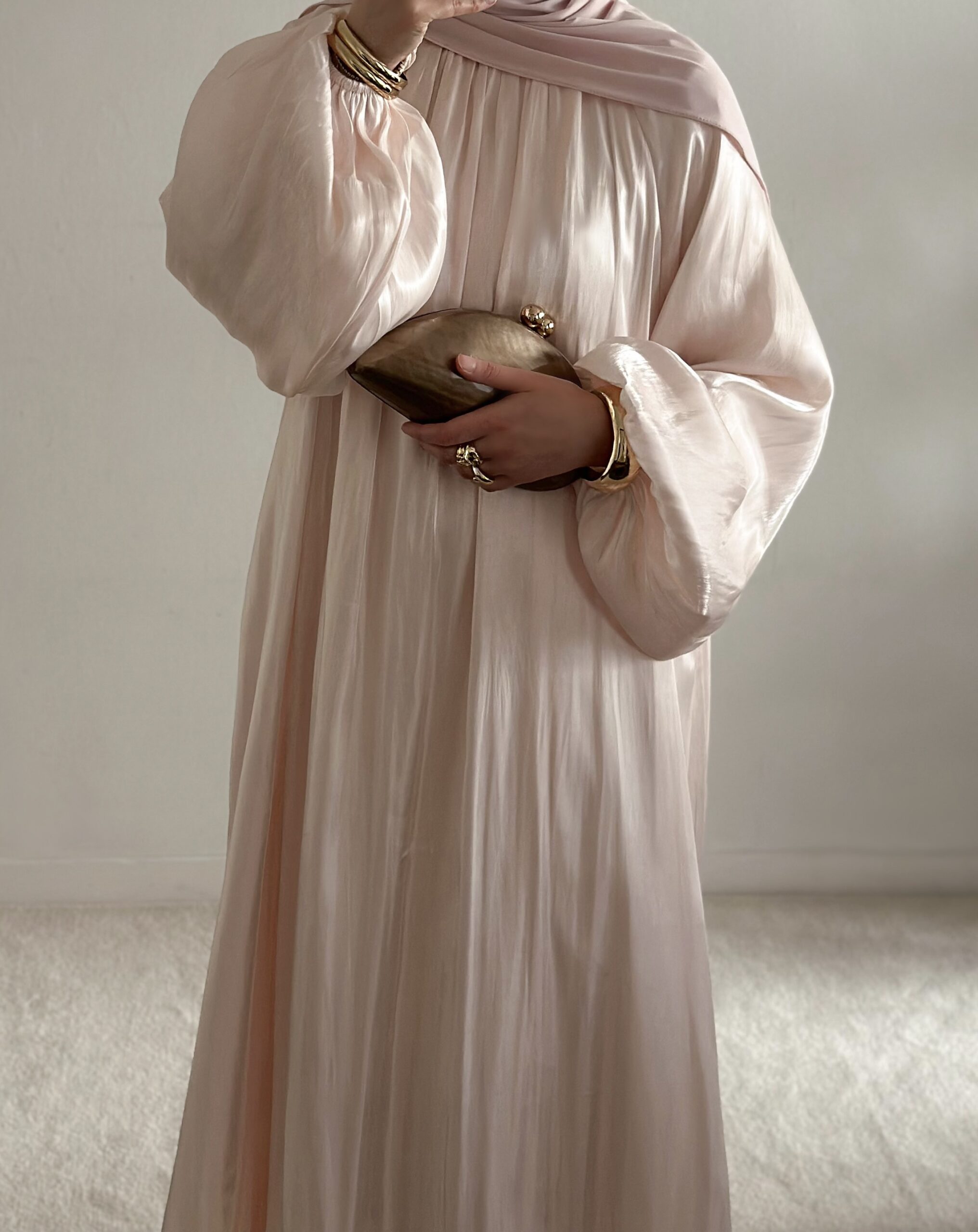 La Abaya Nour Capsule Émirat séduit par son tissu légèrement scintillant et son allure prestigieuse. Dotée de manches bouffantes élégantes, d’un col montant avec bouton discret et d’une doublure anti-transparence.