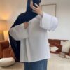 Sa coupe structurée se distingue par une longueur plus importante à l’arrière (76 cm) et légèrement plus courte sur le devant, créant un effet moderne et équilibré. Avec une largeur de 65 cm, une mesure aisselle à aisselle de 58 cm et des manches de 25 cm (toutes les mesures sont mesurées à plat).