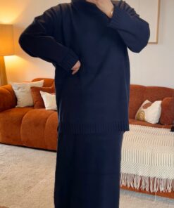 Composé d’un pull à col montant et d’une jupe longue sans fente, il offre une allure à la fois chic et décontractée.