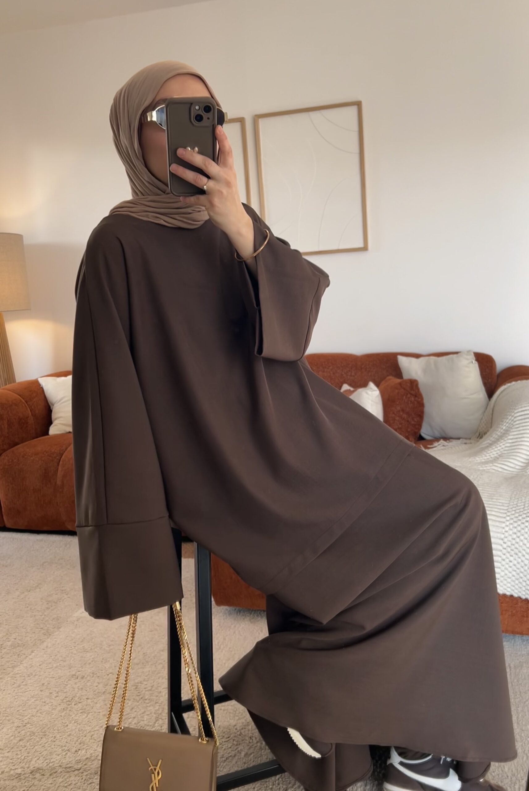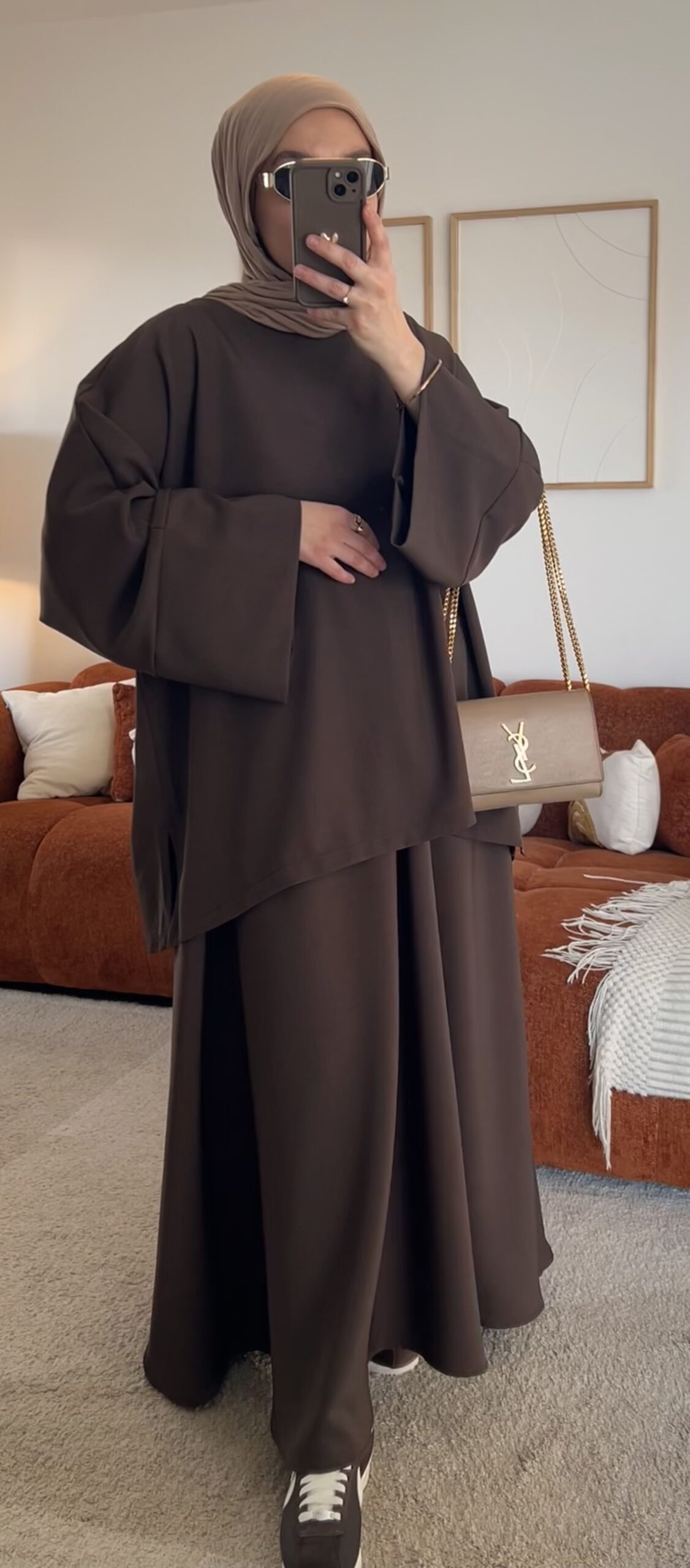 L’ensemble Zineb est une pièce incontournable alliant confort et modernité. Composé de deux pièces, il se distingue par une jupe longue évasée d’environ 105 cm et une tunique ample au tombé fluide, légèrement plus longue à l’arrière pour une silhouette harmonieuse et raffinée.