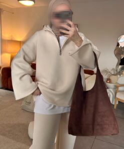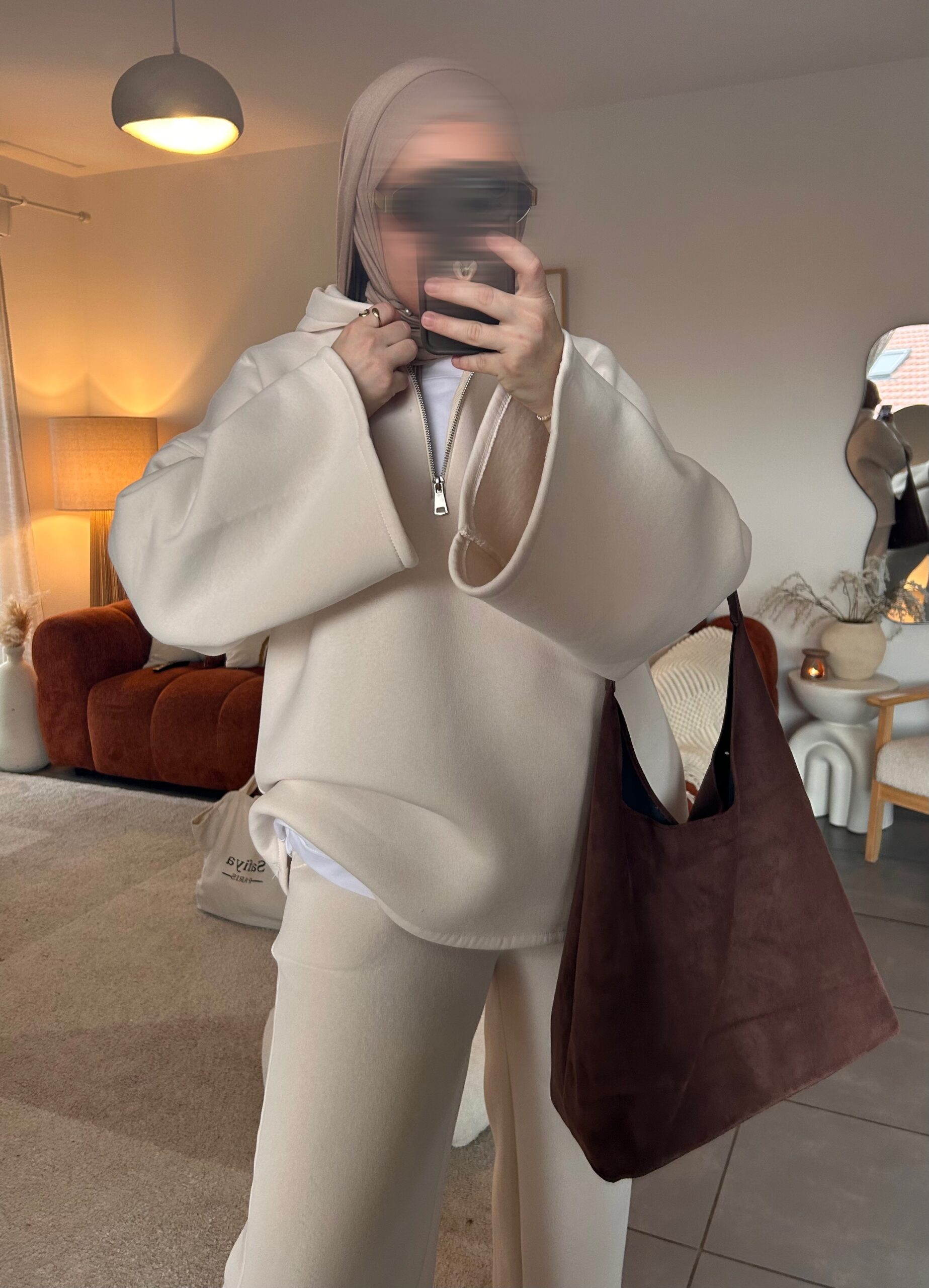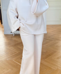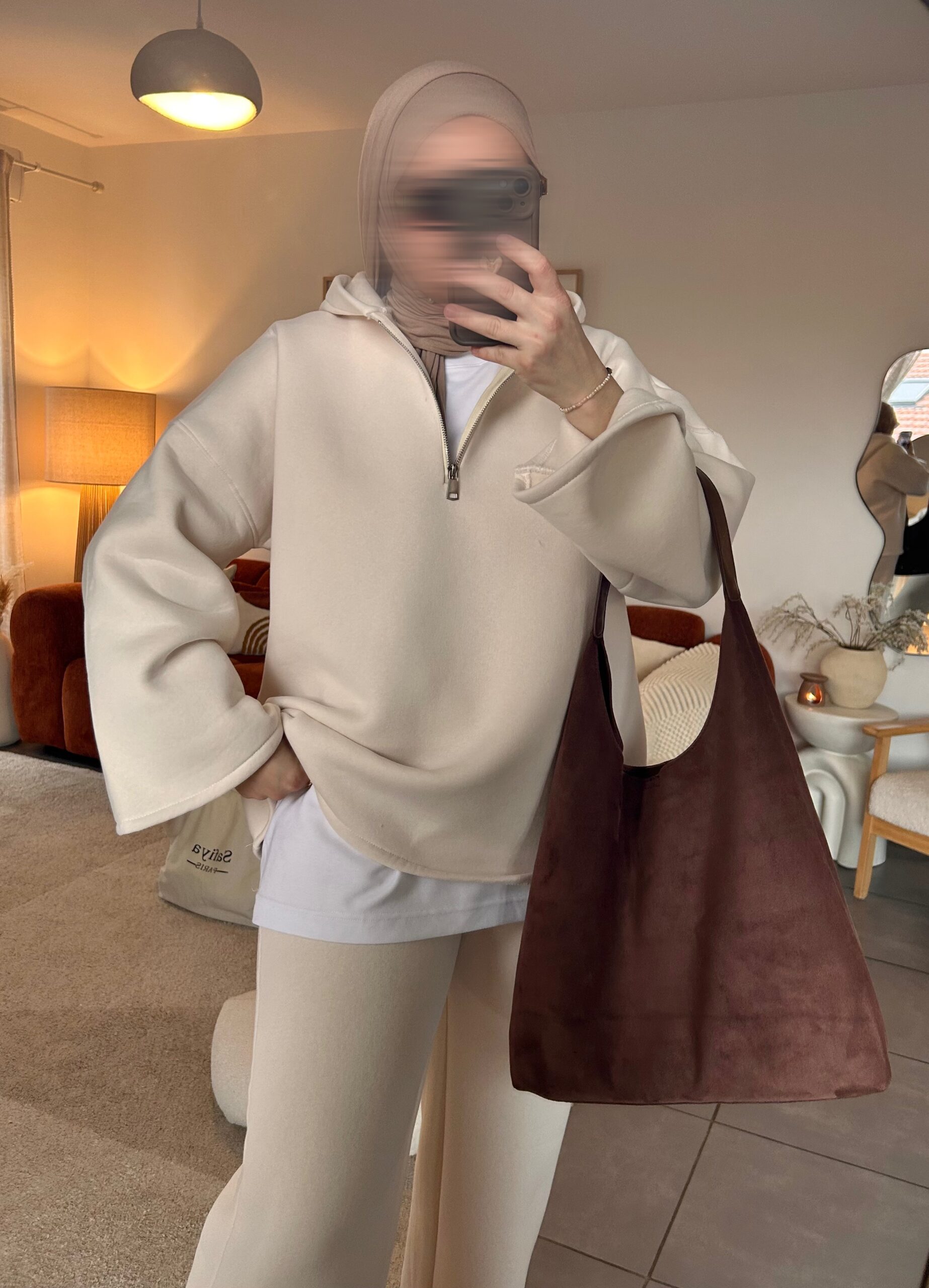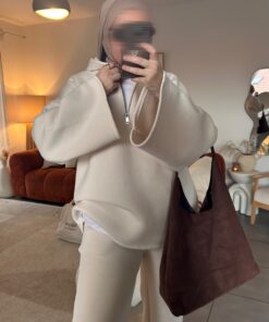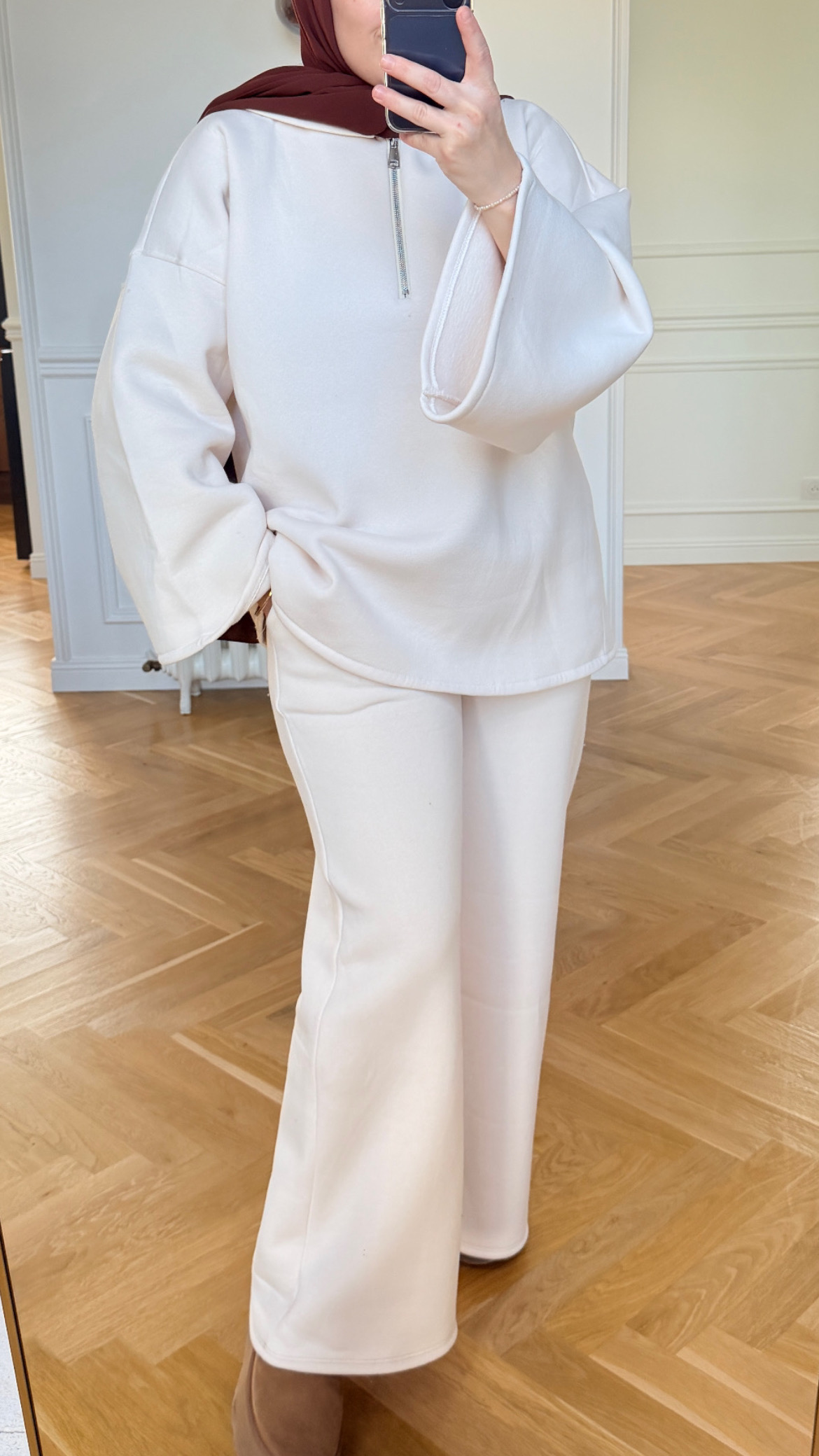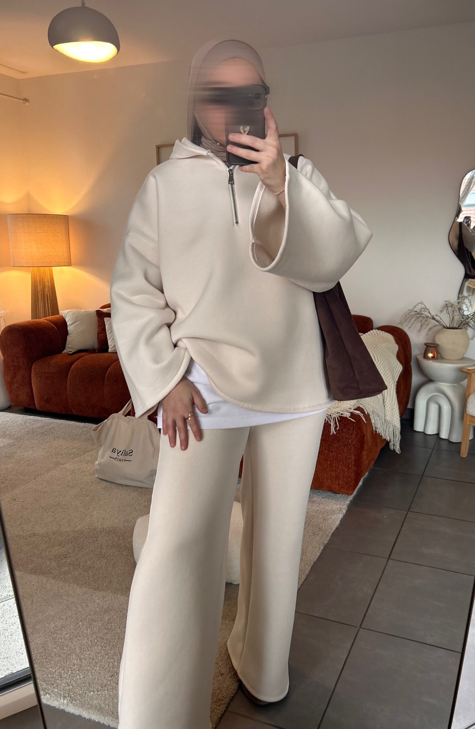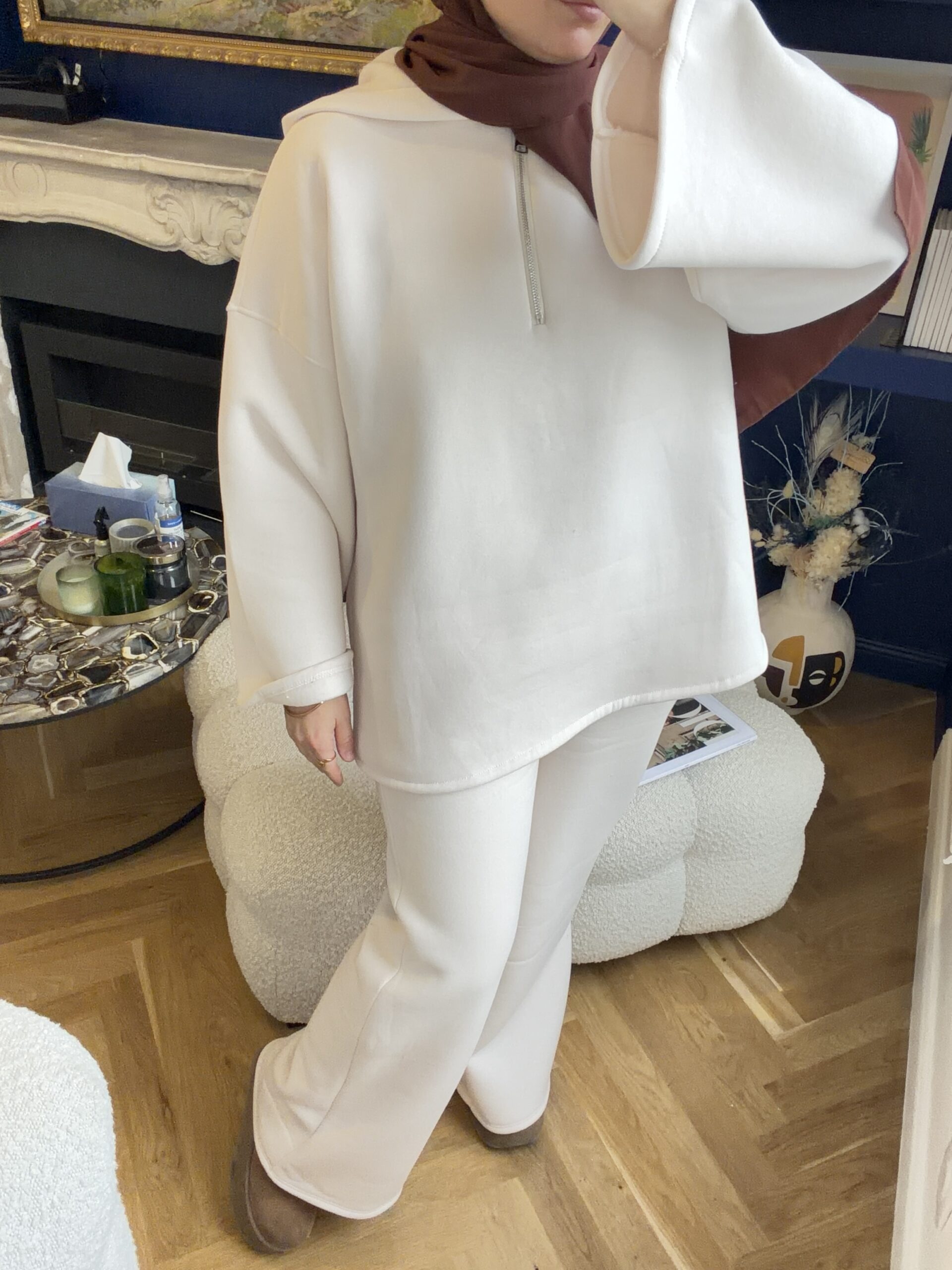 Composé d’un pantalon avec poches latérales et d’un sweat à capuche zippé très chaud, il est idéal pour vos looks mastour cet hiver.