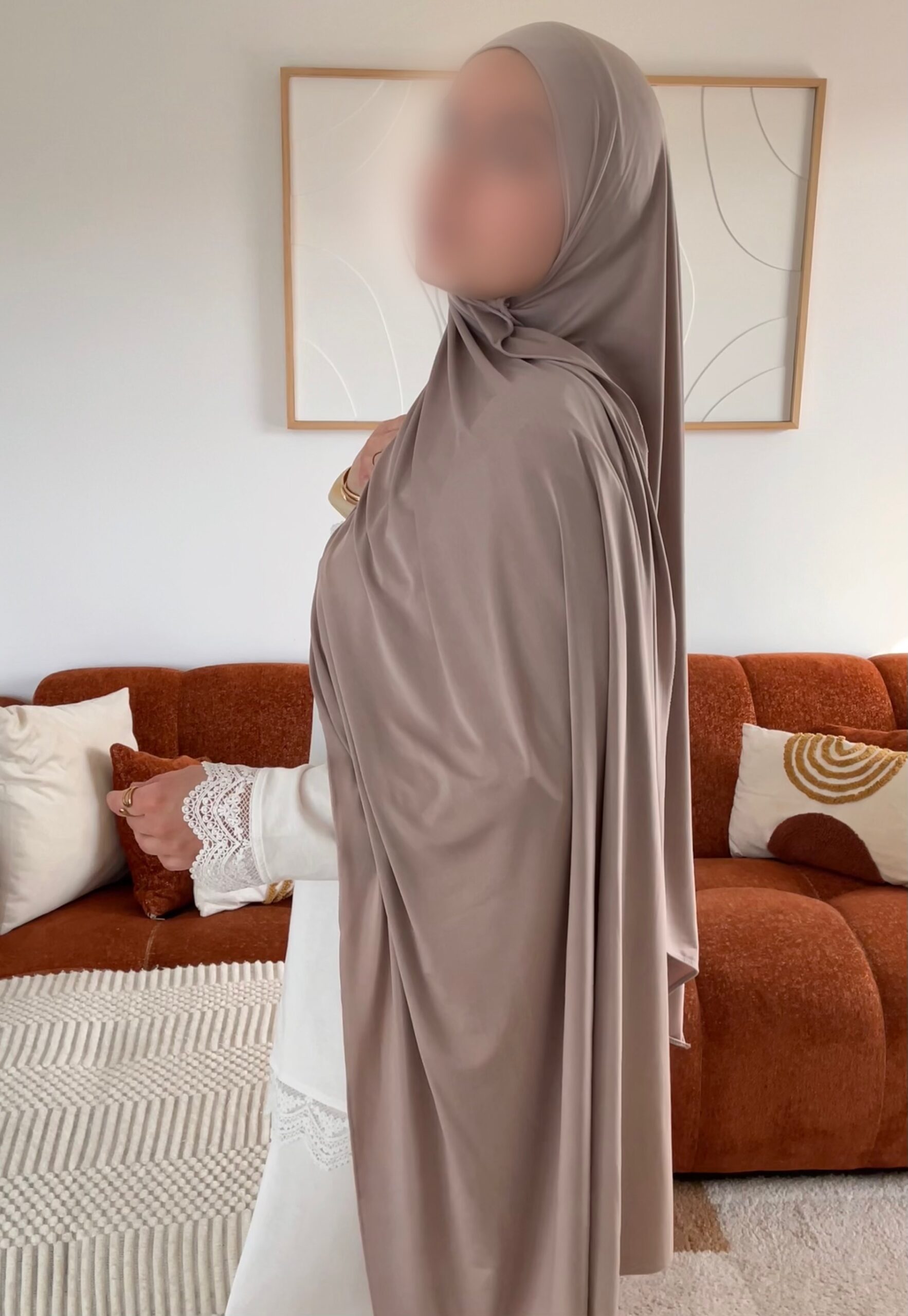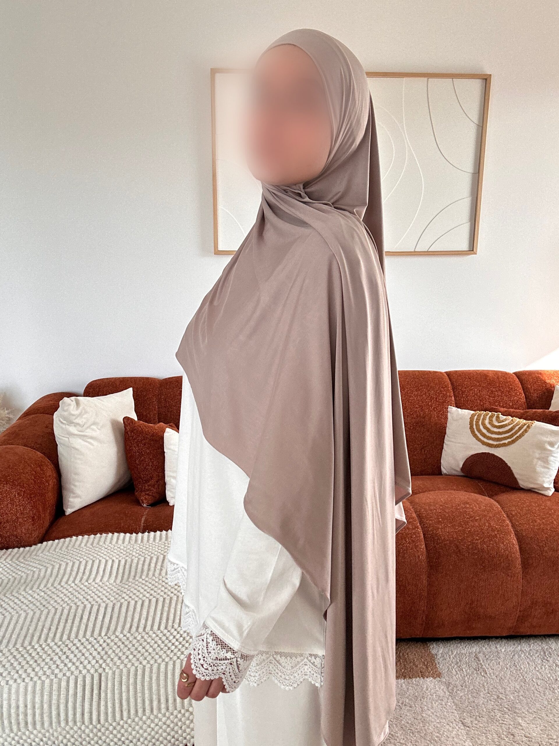 Hijab jersey liquide, doux, fluide et très agréable à porter. Sa matière légère offre un joli tombé naturel et un confort optimal tout au long de la journée.