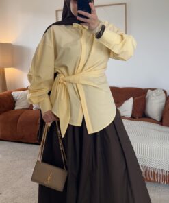 Elle est équipée de poches pratiques et se ferme grâce à une petite fermeture discrète sur le côté. La taille n’est pas élastique mais possède des passants permettant d’ajouter une ceinture pour ajuster la taille selon votre style.