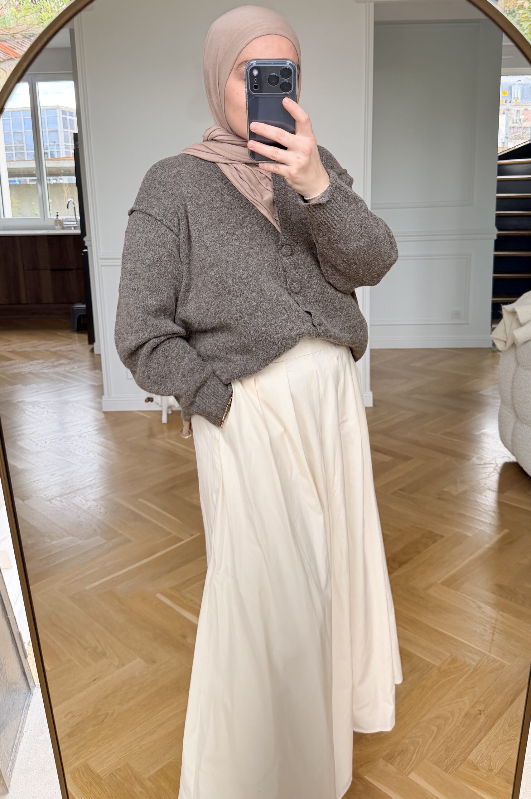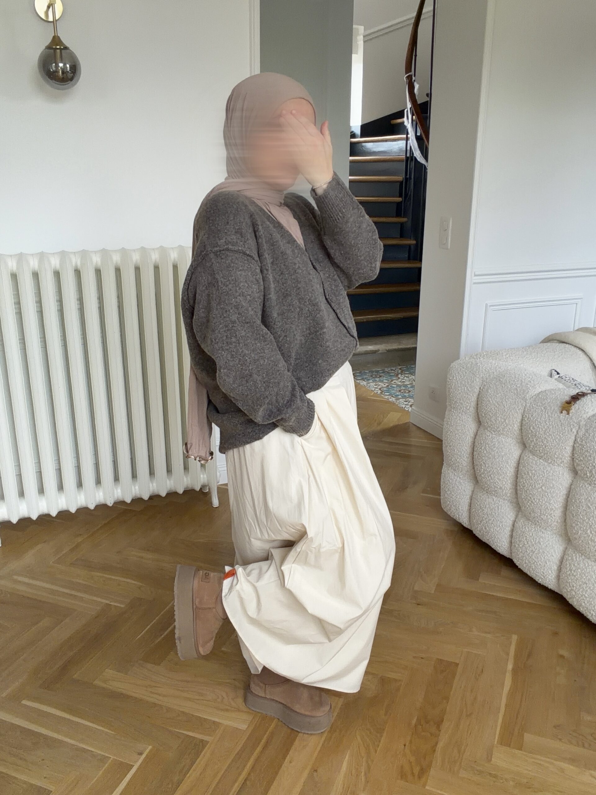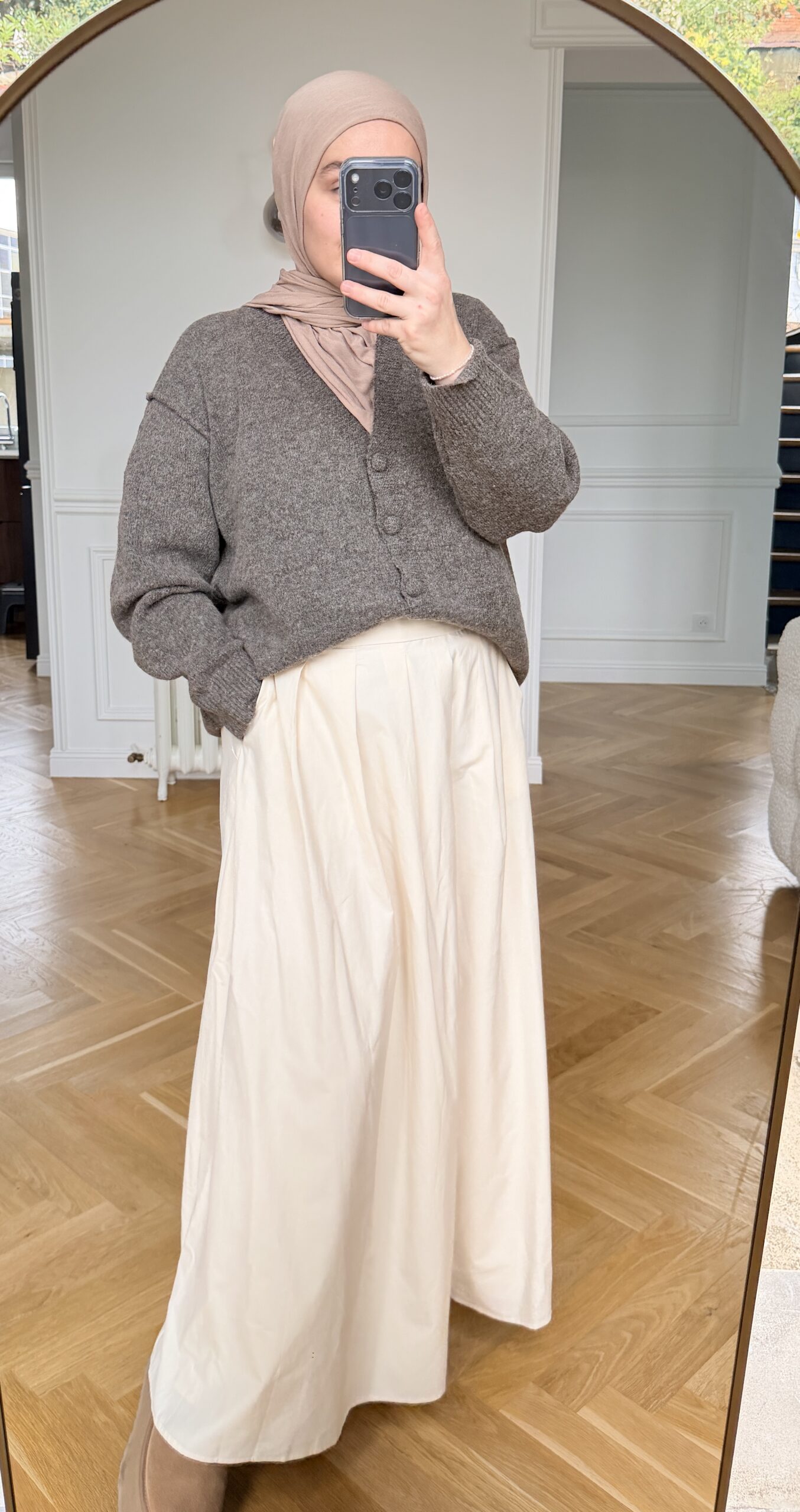 ✨ Le cardigan taupe porté ici fait également partie de notre collection, pour une tenue harmonieuse et élégante.