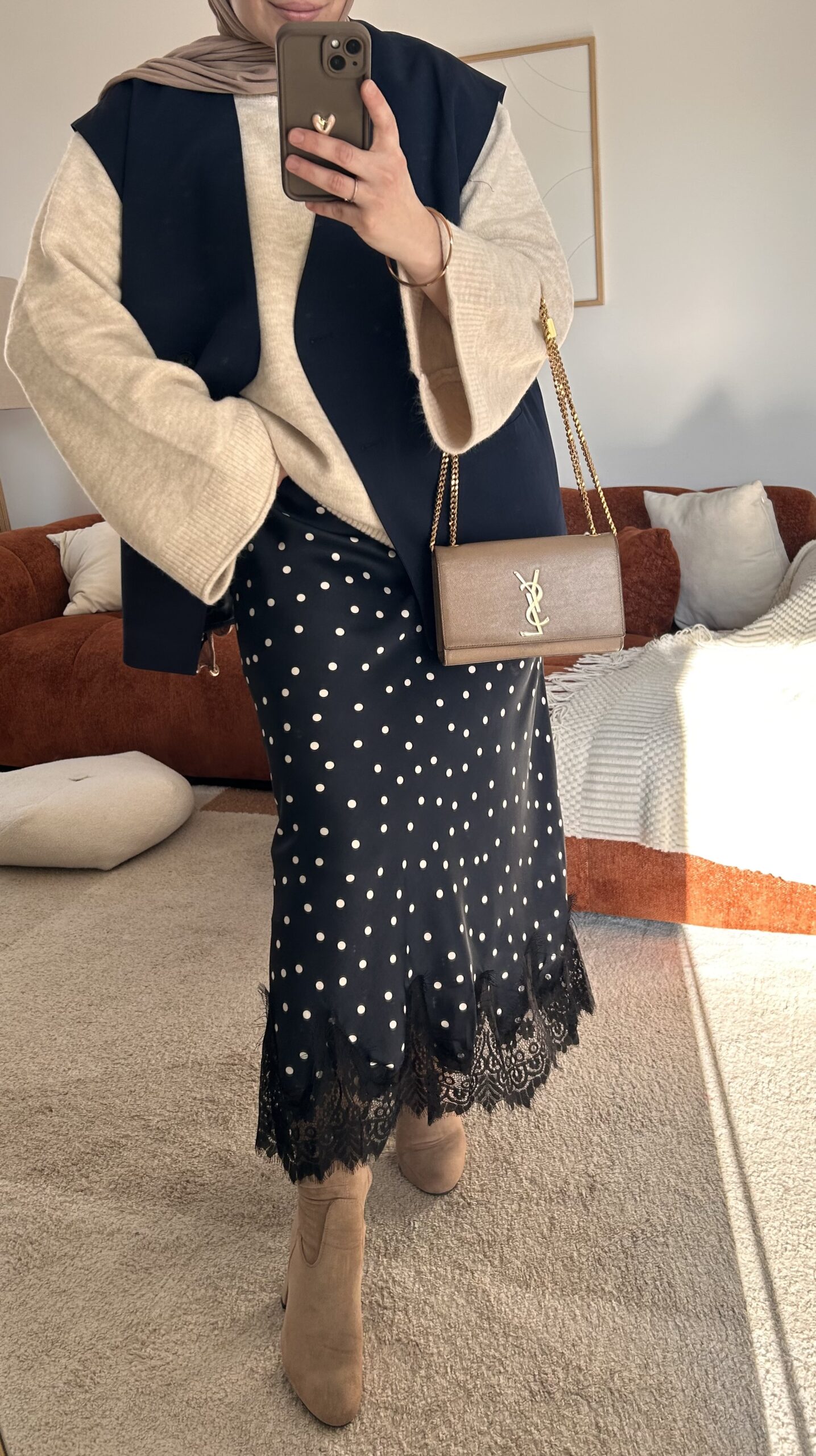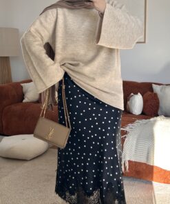 Apportez une touche sophistiquée à vos tenues avec cette jupe fluide à petits pois. Sa coupe légèrement plus longue sur les côtés crée un effet moderne, tandis que sa taille élastique assure un confort optimal.