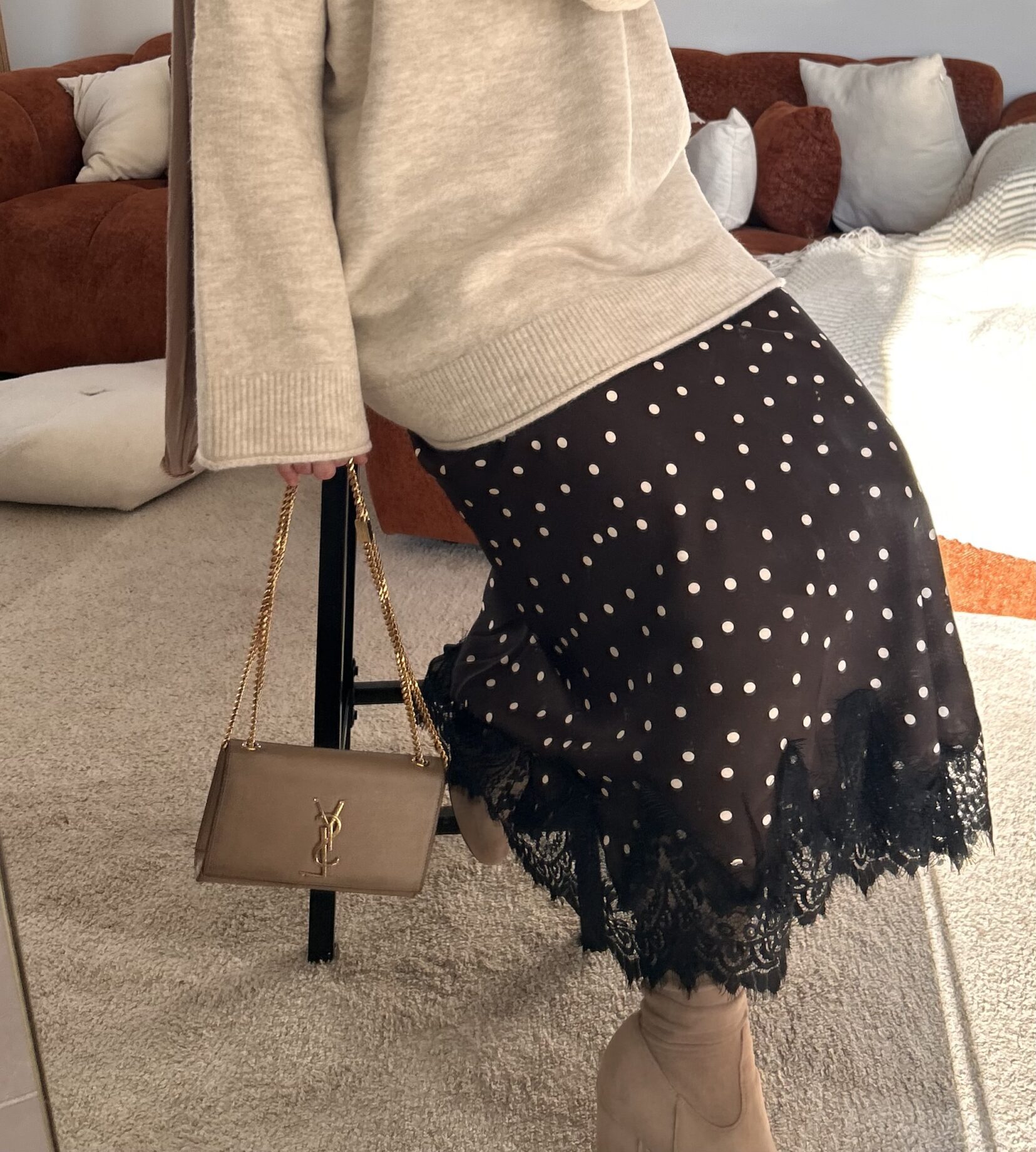 Jupe fluide à petits pois avec bande en dentelle, légèrement plus longue sur les côtés pour un style moderne et élégant. Taille élastique confortable, tissu satiné facile à porter au quotidien.